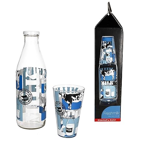 MamboCat Milchflaschen Set Natural Milk I Flirt Milchglasflasche 1 L mit Schraubverschluss und 310 ml Trinkglas mit Motiv I Designer Weithalsflasche Trinkflasche I Leere Flasche zum Befüllen 1000ml