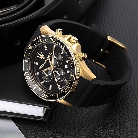 Thông tin sản phẩm Maserati Men's Watch Sfida Collection Stainless Steel Yellow Gold PVD Silicone with Silicone Strap - R8871640001, black, Unit size, Ribbon
