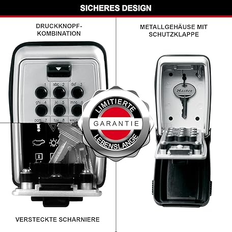 Thông tin sản phẩm Master Lock Schlüsseltresor mit Druckknopf, Wandhalterung, Aussen, 11.7 x 7.9 x 5.2 cm, Schlüsselsafe