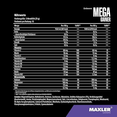 Thông tin sản phẩm Maxler Mega Gainer - Weight Gainer zum Muskelaufbau - Erdbeere - 1000g - Kombination von Eiweiß, Kohnelhydraten, Vitaminen & Mineralien - 10%-Anteil von Molkenprotein - kalorienreicher Shake