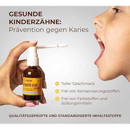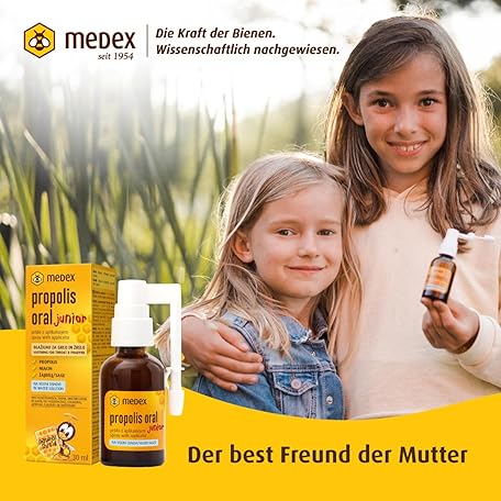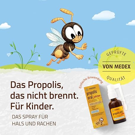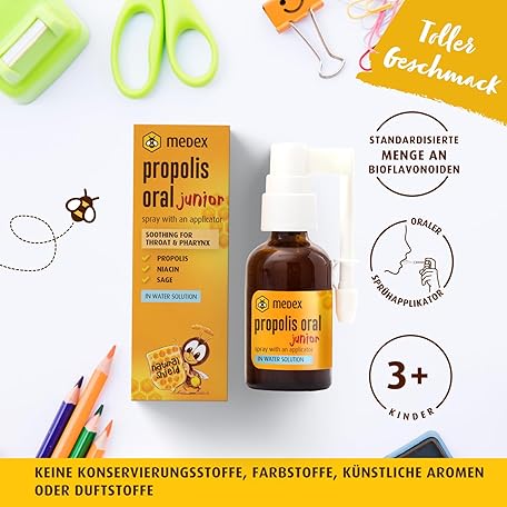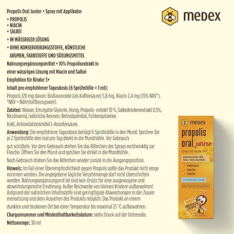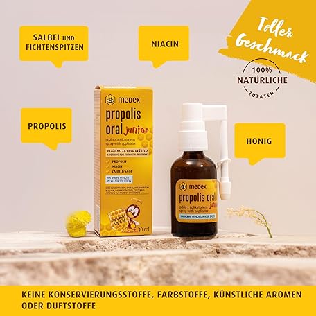 Sản phẩm Medex Propolis Oral Junior, alkoholfrei Mundspray und Rachenspray, wasserbasiert, OHNE Alkohol; mit Zusatz von Honig, Salbei, Niacin, Fichtenspitzen, mit Applikator, für Kinder ab 3 Jahren, 30 ml đang được bán với giá ưu đãi là $20.0669 tại nước Đức.
