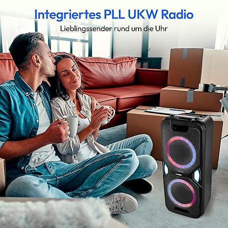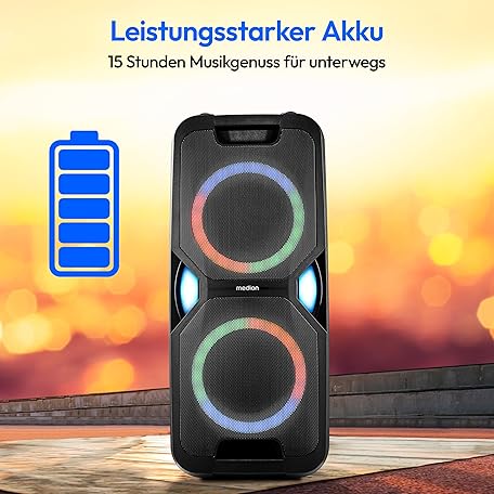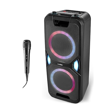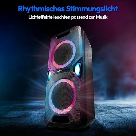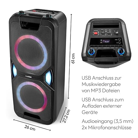 Thông tin sản phẩm MEDION P61468 Party Sound System (Party Speaker with Microphone, Karaoke, Battery, FM Radio, Bluetooth 5.0, Compact System, 2 x 220 Watt, Coloured LED, USB, AUX, 2 x Microphone Connection)