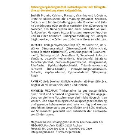 Thông tin sản phẩm MEGAMAX Drinking Gelatin Plus L-Cysteine, Manganese and Calcium | Collagen Hydrolysate - Collagen Protein Powder - for Connective Tissue, Joints, Muscles & Bones | High-Quality Collagen Hydrolysate -