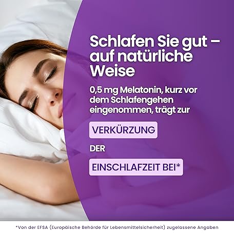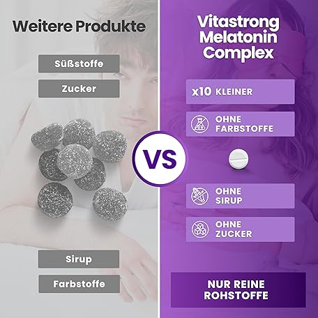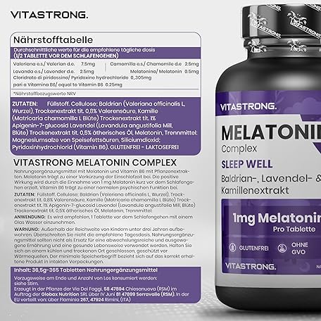 Thông tin sản phẩm Melatonin Vitastrong Komplex, 365 Mikro-Tabletten, Hochdosiert mit Kamille, Baldrian, Lavendel und Vitamin B6, Melatonin Tabletten für Schlafqualität und Jetlag, Zucker- Gluten- und GVO-Frei