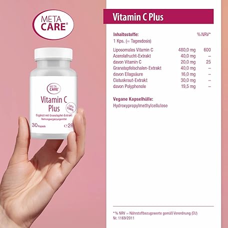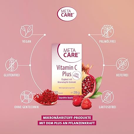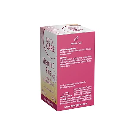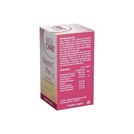 Sản phẩm META CARE Vitamin C Plus - Gentle on the Stomach - Liposomal - Also Well Tolerated for Sensitive People - Supplemented with Cistus Herb Extract, Pomegranate Extract and Acerola - Vegan - 30 Capsules đang được bán với giá ưu đãi là $22.9554 tại nước Đức.