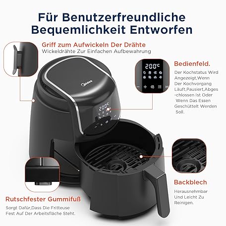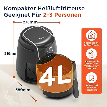 Thông tin sản phẩm Midea MF-CN40C2 Heißluftfritteuse 4L, Ölfreie Airfryer 1500W, 8 Vorprogrammierte Kochmodi, 35-200℃, Backen, Braten, Grillen, Auftauen, Schüttelalarm, 60-Minuten Timer, 41 Rezepten, Spülmaschinenfest