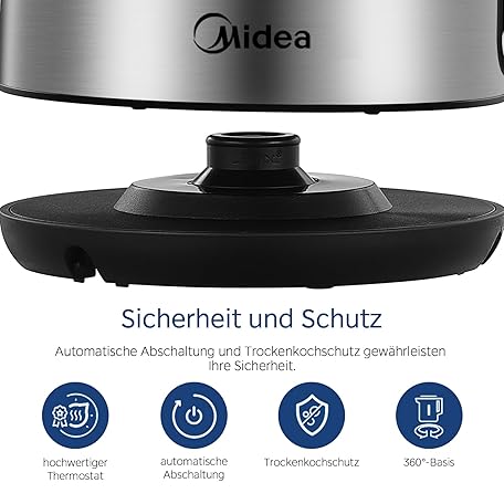 Thông tin sản phẩm Midea MKE17M1ADS Stainless Steel Kettle, 1.7 L, BPA-Free Kettle, 2200 W Quick Boil Function, Kettle with Water Level Indicator, LED Light Indicator, 360° Base, Dry Run Protection, MKE17M1ADS