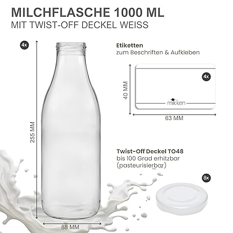 Sản phẩm mikken 4 Glass Bottles 1000 ml Juice Bottles Milk Bottles with 8 Lids White with Labels đang được bán với giá ưu đãi là $21.3313 tại nước Đức.
