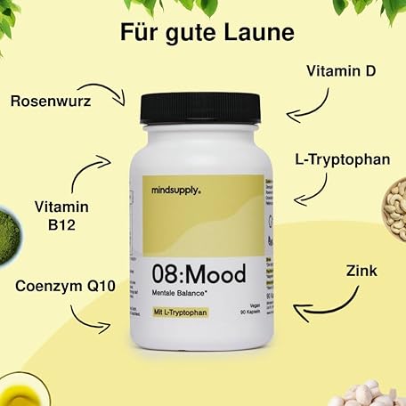 Sản phẩm mindsupply® Mood, 90 Anti-Stress Capsules, Mood Brightener, Serotonin Synthesis with L-Tryptophan, Rose Root Extract, Vitamin B12, B6, D & Q10, Vegan Capsules Against Stress & Fatigue đang được bán với giá ưu đãi là $42.9896 tại nước Đức.