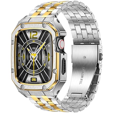 MioHHR Edelstahl-Uhrengehäuse mit Bändern, kompatibel mit Apple Watch Band 46 mm, Metallabdeckung, Stoßfänger mit iWatch-Bändern für Apple Watch Serie 10, 46 mm, Silber/Gold