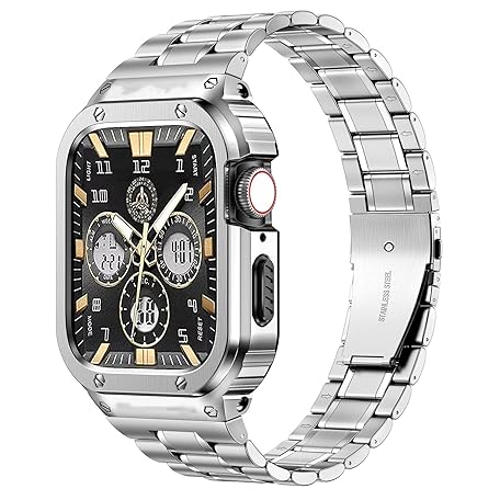 MioHHR Metallbänder mit Hülle kompatibel für Apple Watch Band 44 mm, stoßfestes Edelstahlgehäuse und Ersatzband mit Schutzhülle für iWatch Serie 6/5/4/SE für Herren(Silber)