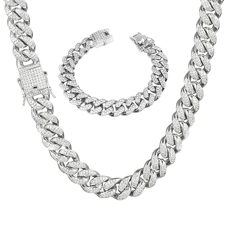 MIRKUZI Men's Cuban Link Miami Choker Necklace Bracelet Set Hip Hop Jewellery for Boys Men Bling Bling Diamond Chain (Silver)