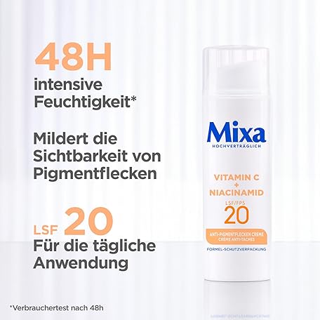 Sản phẩm Mixa Anti-pigment spot cream, for uneven, dull and sensitive skin with vitamin C and niacinamide, suitable for face and neck, SPF 20, hypoallergenic, 50 ml đang được bán với giá ưu đãi là $15.7723 tại nước Đức.