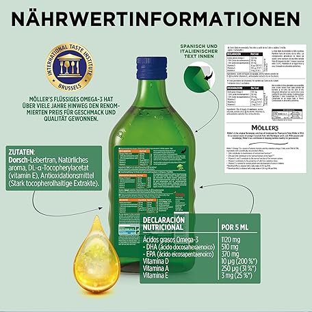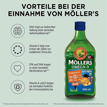 Sản phẩm Möller's Omega 3 Cod Liver Oil, Nordic Omega 3 Children's Dietary Supplement with EPA, DHA, Vitamin A, D and E, High Purity Natural Cod Liver Oil, 165 Year Old Brand, Tutti Frutti, 500 ml đang được bán với giá ưu đãi là $23.9037 tại nước Đức.