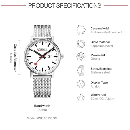 Thương hiệu Mondaine là cái tên nổi tiếng được rất nhiều khách hàng trên thế giới chọn lựa. Với kiểu dáng đẹp mắt, sang trọng, sản phẩm Mondaine - Evo2 Men's Watch 40 mm - Station Clock in Silver Date Display - 30 m Waterproof Sapphire Glass with Red Second Hand - Made in Switzerland - Multiple Variations là sự lựa chọn hoàn hảo nếu bạn đang tìm mua một món cho riêng mình.