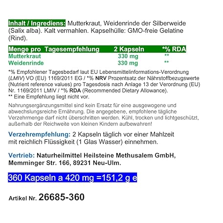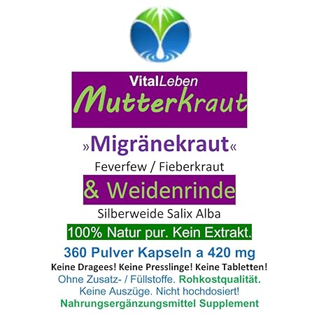 Sản phẩm Mother Herb + Willow Bark 360 Capsules [Migraine Herb Feverfew Feverweed] – Women's Universal Remedy According to Hildegard von Bingen. 100% Pure Natural [Without Additives] 26685-360 đang được bán với giá ưu đãi là $40.9622 tại nước Đức.