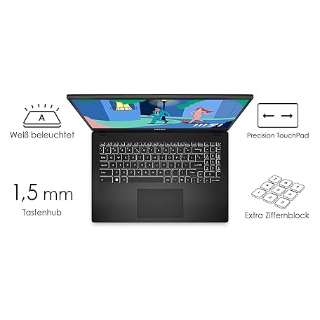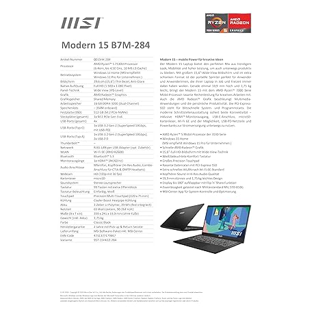 Thông tin sản phẩm MSI Modern 15 Lifestyle & Business Laptop, 40 cm, Full HD Display, AMD Ryzen 5 7530U Processor, 16GB DDR4 RAM, 512GB SSD, AMD Radeon Graphics, Windows 11 Home, Black, B7M-284