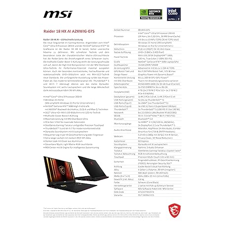 Thông tin sản phẩm MSI Raider 18 HX AI Gaming Laptop, 18 Inch UHD+ Mini LED Display, Intel Core Ultra 9, NVIDIA GeForce RTX 5080, 64GB DDR5 RAM, 4TB SSD, Windows 11 Home, QWERTZ Keyboard, Black, A2XWIG-075