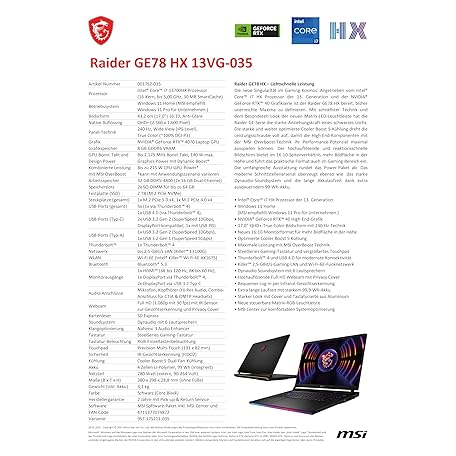 Thông tin sản phẩm MSI Raider GE78 HX, 43.2 cm (17.0 Inch) QHD+, 240 Hz, Intel Core i7-13700HX, 2 x 16 GB RAM, 2 TB SSD, RTX 4070, Windows 11 Home, QWERTZ Keyboard, Black, 13VG-035
