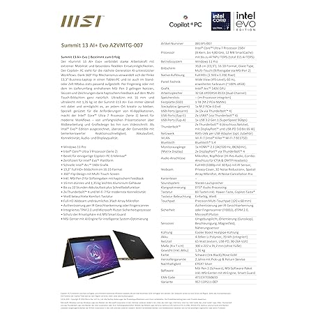 Thông tin sản phẩm MSI Summit 13 AI+, Business Laptop, Copilot+ PC, 13,3" FHD+, Intel Core Ultra 7 Prozessor 258V, 32 GB LPDDR5X-8533 RAM, 1 TB, Intel Arc 140V GPU, Windows 11 Pro, QWERTZ Tastatur, Evo A2VMTG-007
