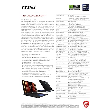 Thông tin sản phẩm MSI Titan 18 HX AI Gaming Laptop, 18" UHD+ Mini LED Display, Intel Core Ultra 9 285HX, NVIDIA GeForce RTX 5090, 64GB DDR5 RAM, 6TB SSD RAID 5, Windows 11 Home, QWERTZ Keyboard, Black, A2XWJG-656
