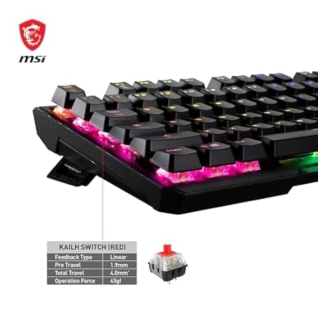 Sản phẩm MSI Vigor GK41 FR Mechanical Gaming Keyboard - Kailh Red Switches (Linear), Ergonomic Keys, Non-Slip Base, 6 Solid Colour LEDs / 10 Lighting Zones, Mystic Light, USB 2.0, Full đang được bán với giá ưu đãi là $94.5902 tại nước Đức.