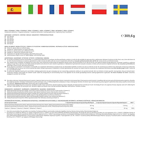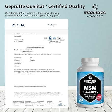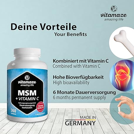 MSM capsules + vitamin C, highly dosed, 360 capsules for 6 months, 1,334 mg organic sulphur powder per day, 99.9% pure methylsulphonylmethane, food supplement without additives, Made in Germany