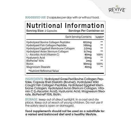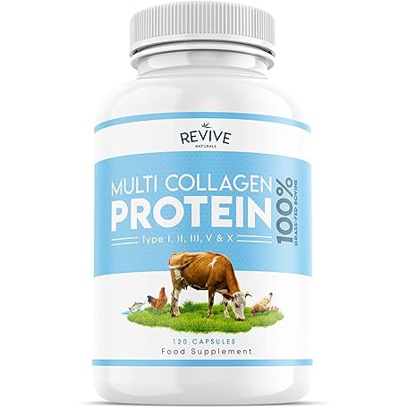 Thông tin sản phẩm Multicollagen Protein Capsules - Pack of 120 - Types I, II, III, V & X - Hydrolysed Grazing Bovine Wild Cattle & Free-Range Chicken, with Hyaluronic Acid & Vitamin C - by Revive Naturals