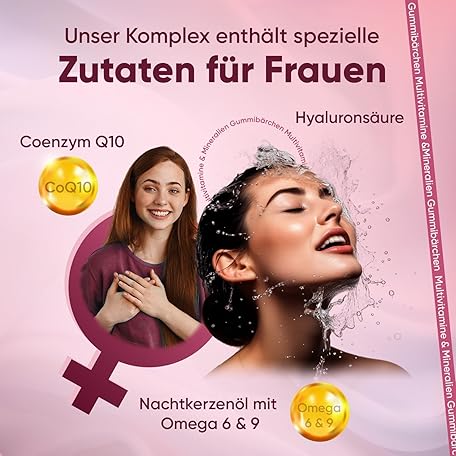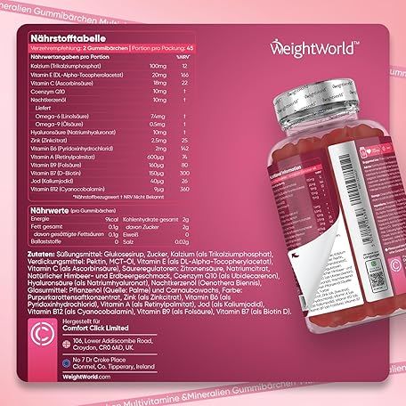 Thông tin sản phẩm Multivitamin Gummies for Women - With Omega 6, 9, Zinc, Calcium, Vitamin C, Hyaluron, CoQ 10, B12, Biotin - 90 Vegan Gummy Bears - Strawberry & Raspberry Flavour - Multivitamin Complex - WeightWorld