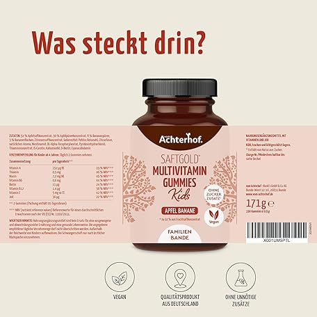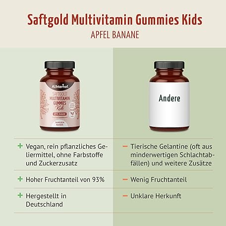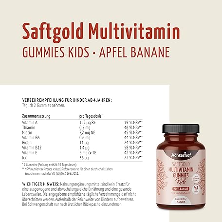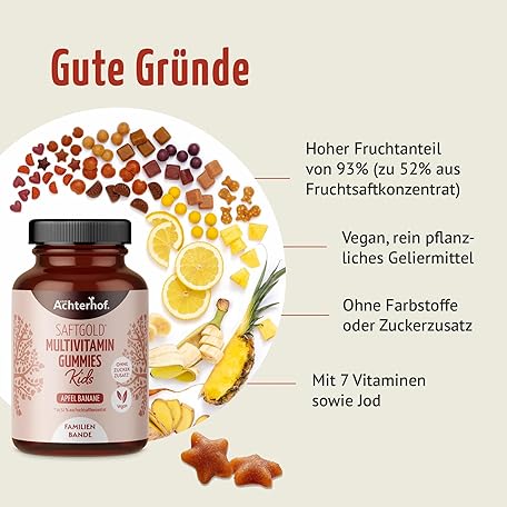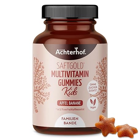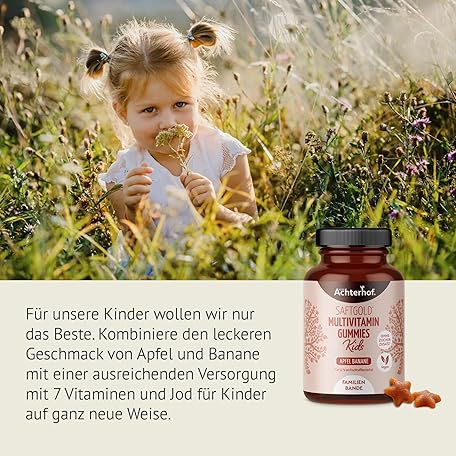 Sản phẩm Multivitamin Kids Gummies Pack of 190 Apple Banana Flavour with 7 Vitamins and Iodine No Added Sugar No Preservatives Vegan Achterhof đang được bán với giá ưu đãi là $21.5384 tại nước Đức.