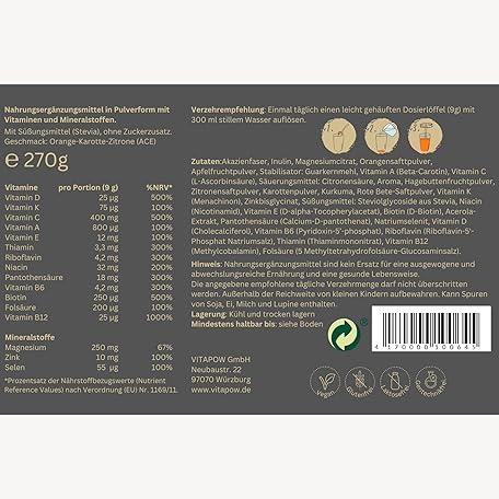 Thông tin sản phẩm Multivitamin Powder + Magnesium, Zinc & Selenium - Vitamins A-Z High Dose - Strengthen Immune System - High-Quality Micronutrients - No Added Sugar - Vegan - Made in Germany - ACE Flavour