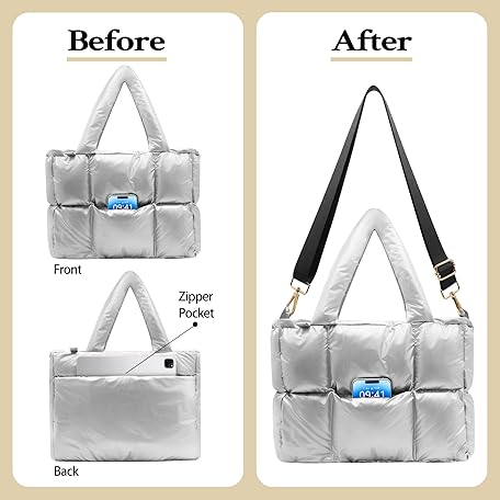 Thông tin sản phẩm NAARIIAN Puffer Tote Bag für Damen, leichte, gesteppte Schultertasche mit verstellbarem Schultergurt, Puffer Bag, Puffertasche, Handtasche für Arbeit, Reisen, Fitnessstudio, Silber