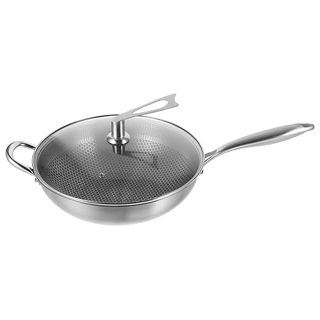 NAMOARLY Edelstahl Wok Mit Deckel Antihaftbeschichtet Für Induktionsherde Gas Und Elektroherde Pfanne Für Gemüse Eier Und Hot Pot Mit Praktischer Wabenstruktur