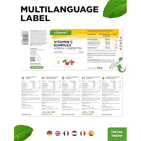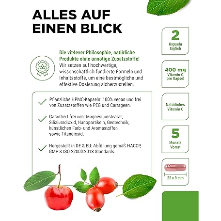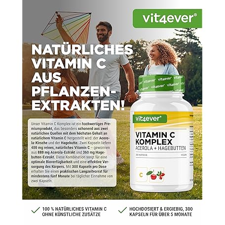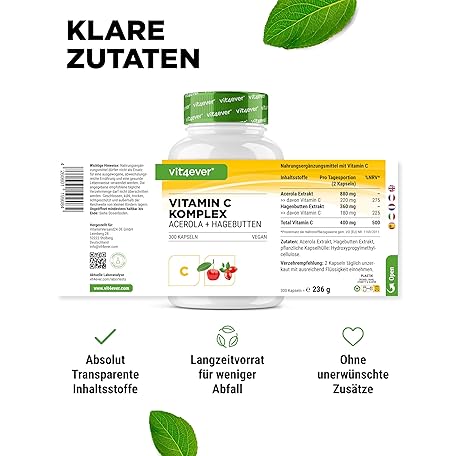 Thương hiệu Vit4ever là cái tên nổi tiếng được rất nhiều khách hàng trên thế giới chọn lựa. Với kiểu dáng đẹp mắt, sang trọng, sản phẩm Natürlicher Vitamin C Komplex - 300 Kapseln im 5 Monatsvorrat - Acerola-Extrakt & Hagebutten-Extrakt mit 400 mg Vitamin C pro Tagesportion - Hochdosiert - Vegan  là sự lựa chọn hoàn hảo nếu bạn đang tìm mua một món  cho riêng mình.