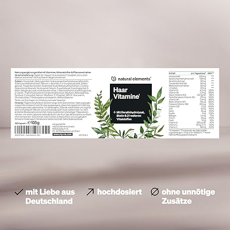 Thông tin sản phẩm natural elements Haar Vitamine – 180 Kapseln – hochdosiert mit Keratinhydrolysat, Biotin, Selen, Zink, Hirseextrakt, B-Vitaminen & mehr – für Haare, Haut & Nägel* – laborgeprüfte Qualität