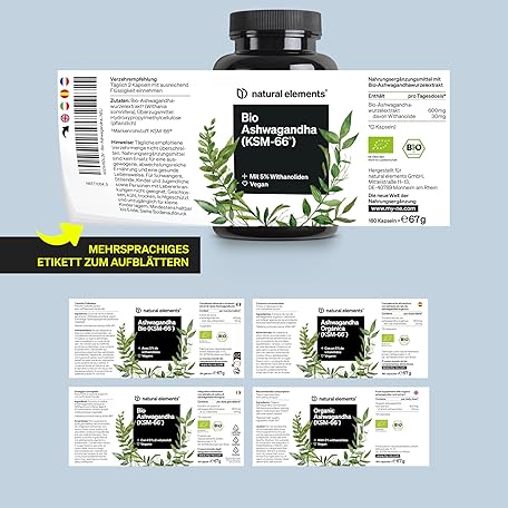 Sản phẩm natural elements Organic Ashwagandha - KSM-66 Premium Raw Material (180 Capsules with Above Average Range) - 5% Withanolide Content - Laboratory Tested, Vegan and High Dose đang được bán với giá ưu đãi là $34.2587 tại nước Đức.