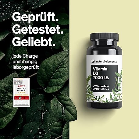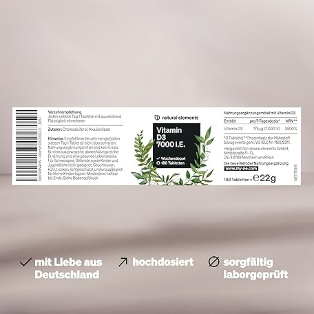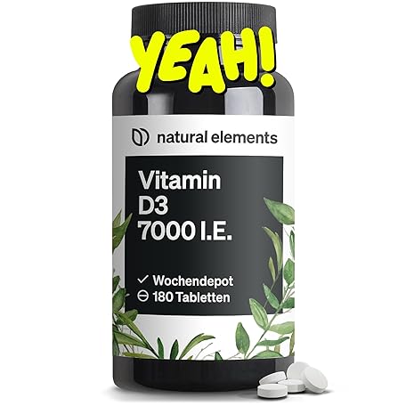 Sản phẩm natural elements Vitamin D3 7000 IU - 180 Tablets - The Sun Vitamin as a Weekly Depot - High Dose, without Unnecessary Additives - Produced in Germany & Laboratory Tested đang được bán với giá ưu đãi là $12.6767 tại nước Đức.