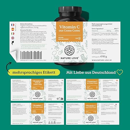 Thông tin sản phẩm Nature Love® Camu Camu Extract Capsules, Natural Vitamin C Pack of 120 in 4-Month Supply, 640 mg Camu Camu Extract Per Capsule Laboratory Tested, Vegan, No Additives, Made in Germany