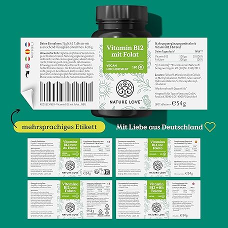 Sản phẩm NATURE LOVE® Vitamin B12 vegan – 500 µg per daily dose – 180 tablets – both active forms adenosylcobalamin & methylcobalamin + depot + folate 5-MTHF from Quatrefolic® - high dose & laboratory tested đang được bán với giá ưu đãi là $26.6614 tại nước Đức.