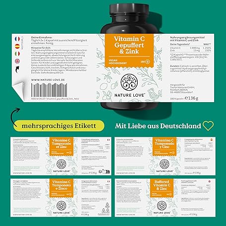 Thông tin sản phẩm NATURE LOVE® Vitamin C Buffered & Zinc - 180 Capsules - High Dose 1000mg + 15mg Zinc - Fermentation of Corn, pH Neutral, Acid-free - Laboratory Tested, Vegan and Produced in Germany