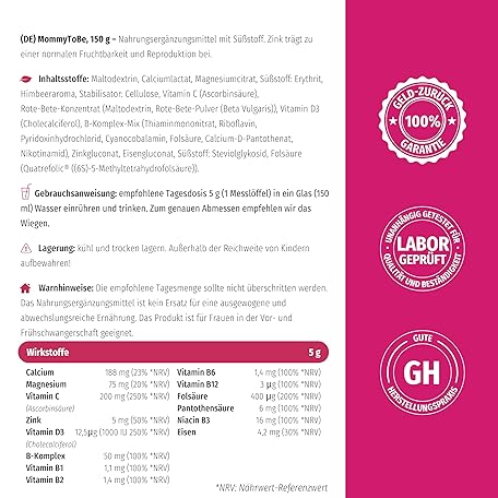 Thông tin sản phẩm Nature's Finest MommyToBe, High Dose Folic Acid Quatrefolic 5-MTHF with Vitamin B12 - Desire for Children & Early Pregnancy - Magnesium, Calcium, Iron, Zinc - 150 g Powder - Made in the EU