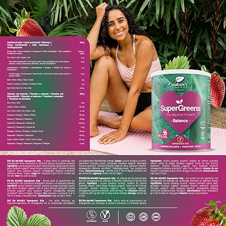 Thông tin sản phẩm Nature's Finest Supergreens Balance - Vegan Protein Powder with Barley Grass, Wheatgrass, Maca, Ashwagandha & Chlorella - Natural Green Helpers for Vitality & Wellbeing - 150 g
