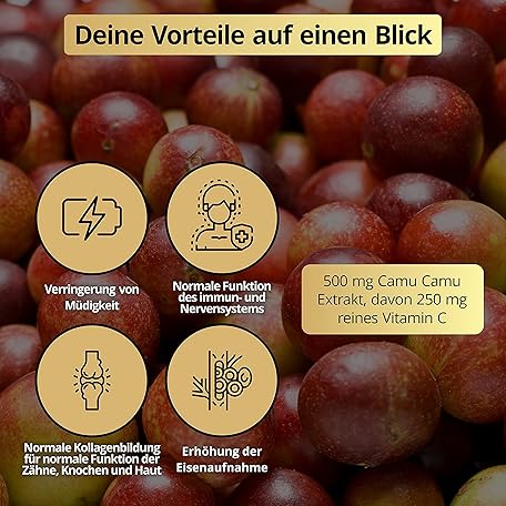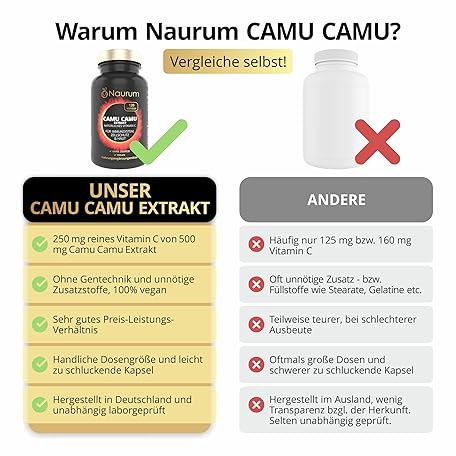 Thông tin sản phẩm NAURUM® Camu Camu Extract - Natural Vitamin C. 500 mg per capsule. 120 capsules in 4 month supply. Laboratory tested, vegan, made in Germany