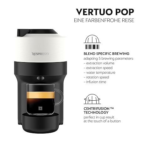 Thông tin sản phẩm Nespresso Krups Vertuo Pop Coffee Capsule Machine, Capacity: 560 ml, Automatic Capsule Detection, One Touch System, 4 Cup Sizes, Shortened Heating Time, Sustainable, Coconut White, XN9201