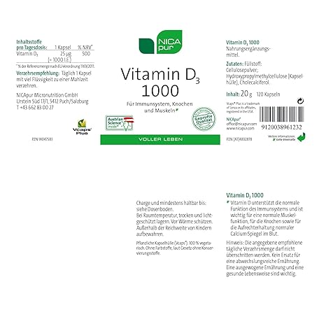 Sản phẩm NICApur Vitamin D3 1000, the basic supply of vitamin D3 for every day, pure substance without additives, 120 capsules 10343 đang được bán với giá ưu đãi là $21.3858 tại nước Đức.