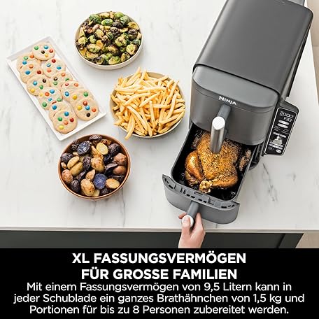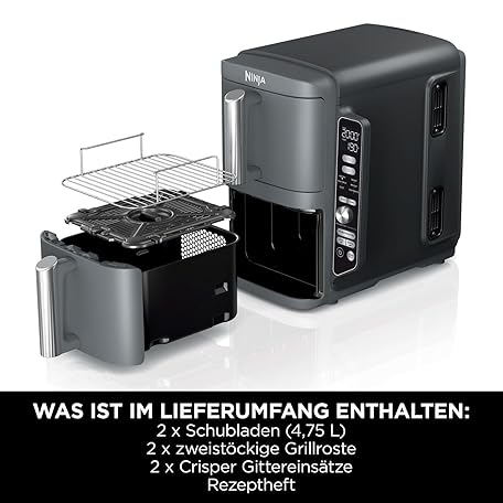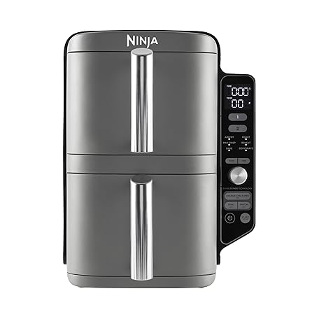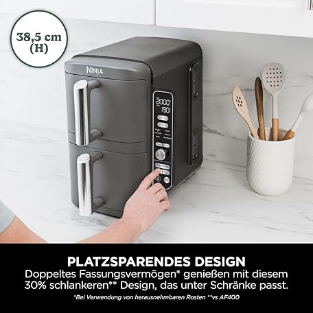 Thông tin sản phẩm Ninja Double Stack XL Air Fryer Hot Air Fryer, 9.5 L Airfryer, Double Basket Hot Air Fryer with 4 Cooking Levels, 2 Baskets, 2 Racks, Space Saving Design, 6 Cooking Functions, 8 Servings, Grey SL400EU