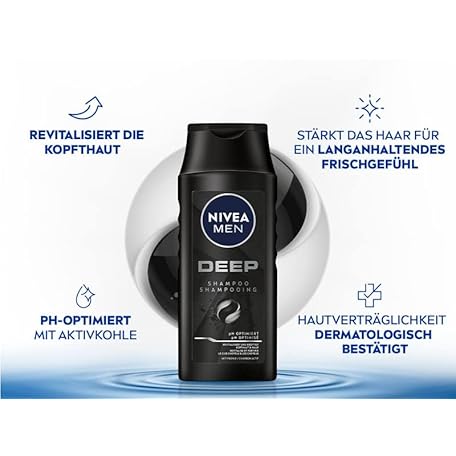 Thông tin sản phẩm NIVEA MEN Deep Shampoo for Men, Against Oily Hair with Activated Carbon, Revitalising for a Long-Lasting Fresh Feeling, Vegan Hair Shampoo for Deep Cleansing (250 ml)