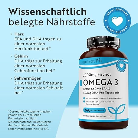Sản phẩm Nutravita High Dose Omega-3 (2000 mg) - 660 mg EPA & 440 mg DHA - Pure Fish Oil Soft Gels - Made in the UK đang được bán với giá ưu đãi là $27.7841 tại nước Đức.