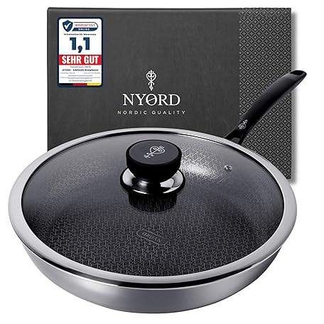 NYORD Stainless Steel Pan - Non-Stick, Scratch-Resistant, Pan Honeycomb Structure, Dishwasher Safe, Hybrid Frying Pan, Ceramic Coating, PTFE & PFOA Free, Oven Safe, for Induction, Gas and Ceramic