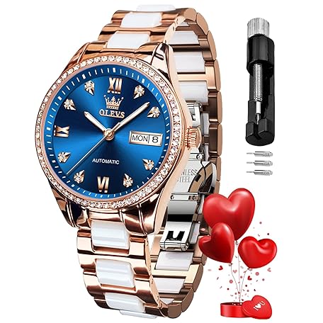 OLEVS Automatic Watches for Women Diamond Fashion Elegant Dress Mechanical Self Winding Date Ladies Watch Luxury Rose Gold Two Tone Ceramic Watch Waterproof Luminous